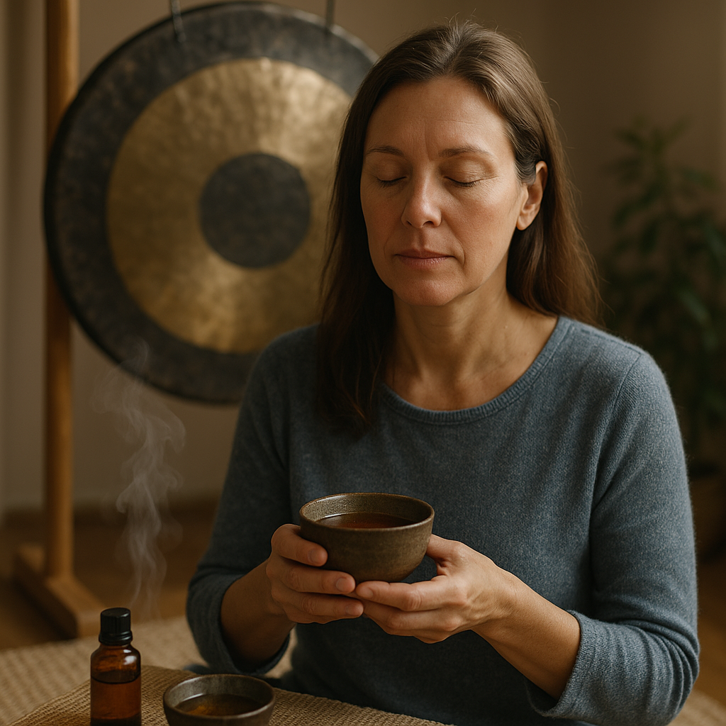 Trvanie: 1,5 hodiny (gongové vibrácie + raindrop aromaterapia + čajový rituál)